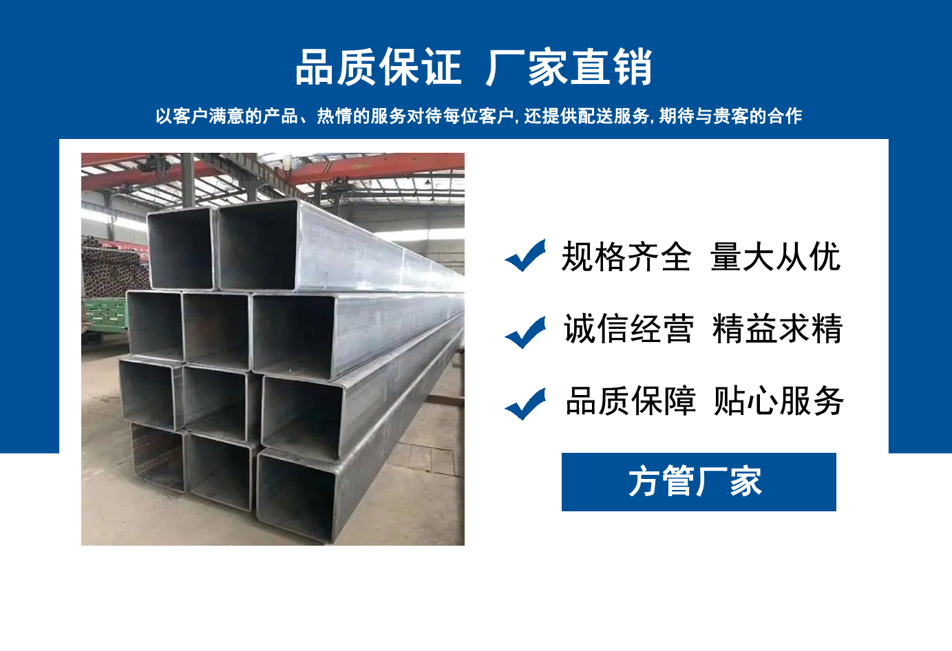 山東方管廠主要生產(chǎn)Q355B方管,Q355C方管,Q355D方管,Q355E方管,低合金方管等,曾多次為客戶解決了各種無縫管疑難問題,經(jīng)不斷的創(chuàng)新與努力,得到了客戶良好的信譽(yù)和稱贊。 公司秉承質(zhì)量、服務(wù)是我們尋求發(fā)展的唯一途徑,為客戶提供極具市場(chǎng)競(jìng)爭(zhēng)力的高品質(zhì)產(chǎn)品,愿與客戶一起進(jìn)步、共享成功! 我公司秉承“誠(chéng)信經(jīng)營(yíng),服務(wù)周到”的經(jīng)營(yíng)原則,全力以赴,給客戶周到滿意的服務(wù)。“誠(chéng)信、專業(yè)、認(rèn)真、服務(wù)”是我們的宗旨。幾年來我們用專業(yè)的技術(shù)和周到的服務(wù)贏得了廣大客戶和供應(yīng)商的信賴,與各大企業(yè)有著廣泛的合作和聯(lián)系,受到了業(yè)內(nèi)好評(píng)。我們會(huì)以優(yōu)良的產(chǎn)品、優(yōu)惠的價(jià)格、優(yōu)先的貨期、優(yōu)良的服務(wù),珍惜客戶給予我們的每一個(gè)機(jī)會(huì)。...